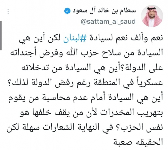 عبر الأمير السعودي سطام بن خالد آل سعود دعمه للسيادة اللبنانية، مؤكدا أن مليشيا حزب الله الموالية لنظام ملالي طهران تهدرها وتفرض أجندتها على الدولة.