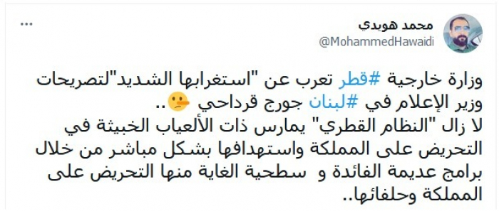 ولفت في تغريدة عبر "تويتر"، اليوم، إلى: "وزارة خارجية قطر تعرب عن استغرابها الشديد لتصريحات وزير الإعلام في لبنان جورج قرداحي".