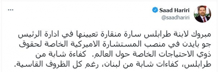 هنأ سعد الحريري، رئيس وزراء لبنان الأسبق، تعيين سارة منقارة، ابنة مدينة طرابلس اللبنانية، في إدارة الرئيس الأمريكي جو بايدن.