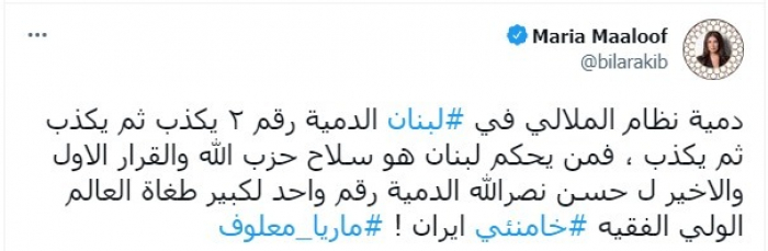 ولفتت إليه في تغريدة عبر "تويتر"، اليوم: "دمية نظام الملالي في لبنان.. الدمية رقم 2 يكذب ثم يكذب ثم يكذب".