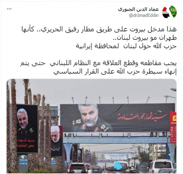 انتقد المحلل السياسي العراقي عماد الدين الجبوري، تخاذل النظام اللبناني تجاه سيطرة مليشيا حزب الله على الدولة حتى أصبح لبنان أشبه بمحافظة إيرانية.