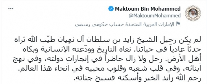 وكتب في تغريدة عبر "تويتر"، اليوم: "لم يكن رحيل الشيخ زايد بن سلطان آل نهيان طيّب الله ثراه حدثا عاديا في حياتنا.. نعاه التاريخ وودّعته الإنسانية وبكاه أهل الأرض".