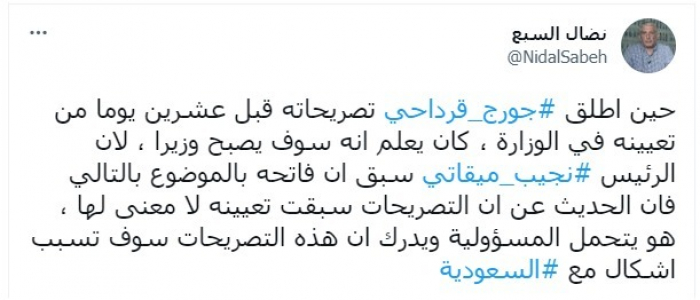 وأشار إلى المدعو جورج قرداحي: "هو يتحمل المسؤولية ويدرك أن هذه التصريحات سوف تسبب إشكال مع السعودية".