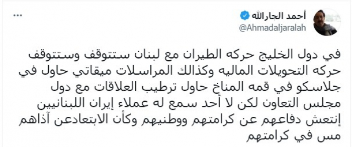 وذكر في تغريدة عبر "تويتر"، اليوم: "في دول الخليج حركة الطيران مع لبنان ستتوقف وكذلك حركة التحويلات المالية والمراسلات".