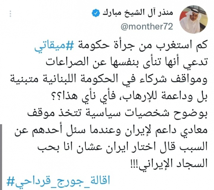 وأردف: "بوضوح شخصيات سياسية تتخذ موقف معادي داعم لإيران وعندما سئل أحدهم عن السبب قال اختار إيران عشان أنا بحب السجاد الإيراني"، مختتما بهاشتاج: "إقالة جورج قرداحي".