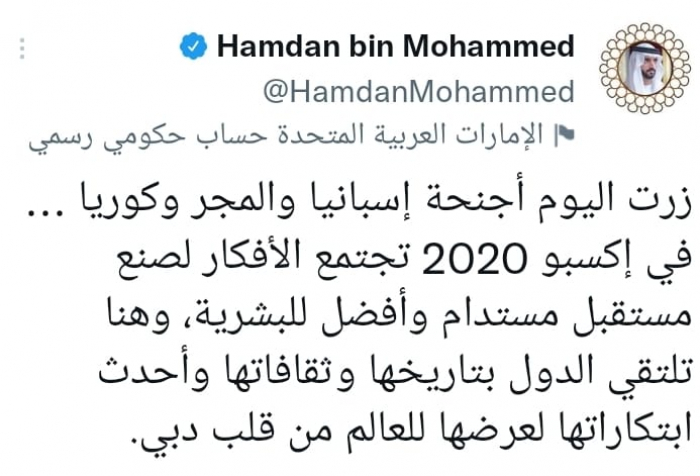 وأوضح أن: "في إكسبو 2020 تجتمع الأفكار لصنع مستقبل مستدام وأفضل للبشرية، وهنا تلتقي الدول بتاريخها وثقافاتها وأحدث ابتكاراتها لعرضها للعالم من قلب دبي".