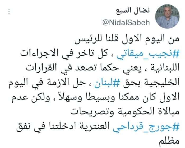 وكشف في تغريدة على حسابه بموقع التدوين المصغر تويتر، اليوم أن: "من اليوم الأول قلنا للرئيس نجيب ميقاتي، كل تأخر في الإجراءات اللبنانية، يعني حكما تصعد في القرارات الخليجية بحق لبنان".