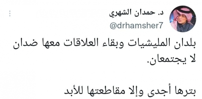 وكشف في تغريدة على حسابه بموقع التدوين المصغر تويتر، اليوم أن: "بلدان المليشيات وبقاء العلاقات معها ضدان لا يجتمعان، بترها أجدى وإلا مقاطعتها للأبد".