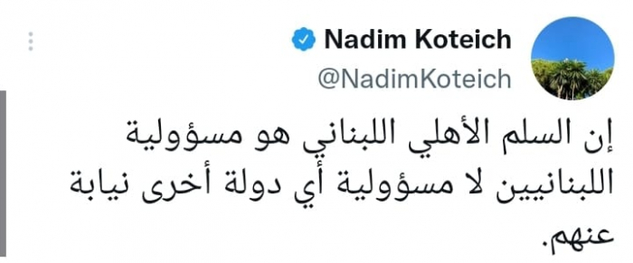 وقال في تغريدة على حسابه بموقع التدوين المصغر تويتر، اليوم إن: "السلم الأهلي اللبناني هو مسؤولية اللبنانيين لا مسؤولية أي دولة أخرى نيابة عنهم".