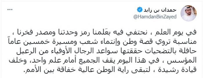 وكتب في تغريدة عبر "تويتر": "في يوم العلم، نحتفي فيه بعَلمنا رمز وحدتنا ومصدر فخرنا، مناسبة تروي قصة وطن وانتماء شعب ومسيرة خمسين عاما حافلة بالتضحيات حققتها سواعد الرجال الأوفياء من الرعيل المؤسس".