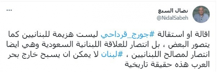 واعتبر في تغريدة عبر "تويتر"، اليوم، أن: "إقالة أو استقالة جورج قرداحي ليست هزيمة للبنانيين كما يتصور البعض".