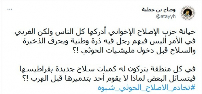 وواصل هجومه على مليشيات الشرعية الإخوانية: "في كل منطقة يتركون له كميات سلاح جديدة بقراطيسها، فيتسائل البعض لماذا لا يقوم أحد بتدميرها قبل الهرب؟"، مختتما تغريدته بهاشتاج: "تخادم الإصلاح والحوثي بشبوة".