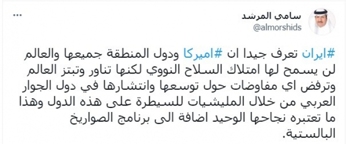 وأوضح في تغريدة عبر "تويتر"، اليوم: "إيران تعرف جيدا أن أمريكا ودول المنطقة جميعها والعالم لن يسمح لها امتلاك السلاح النووي".