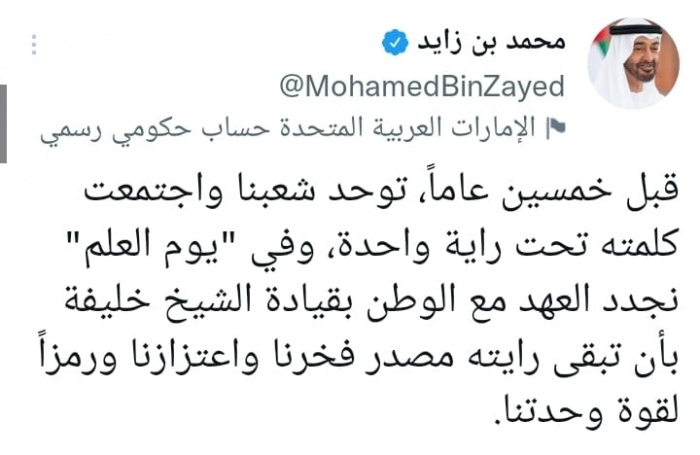 وقال في تغريدة على حسابه بموقع التدوين المصغر تويتر، اليوم إن: "قبل خمسين عاماً، توحد شعبنا واجتمعت كلمته تحت راية واحدة، وفي "يوم العلم" نجدد العهد مع الوطن بقيادة الشيخ خليفة بأن تبقى رايته مصدر فخرنا واعتزازنا ورمزاً لقوة وحدتنا".