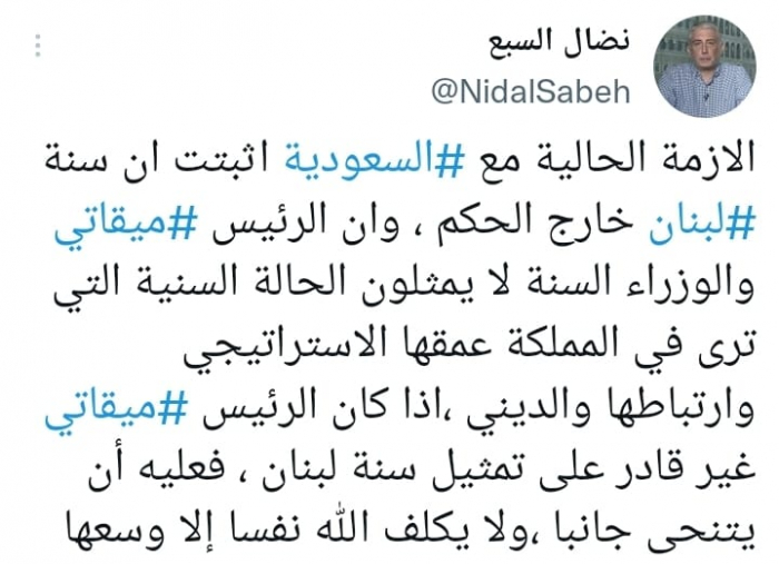 ورأى في تغريدة على حسابه بموقع التدوين المصغر تويتر، اليوم أن: "الأزمة الحالية مع السعودية أثبتت أن سنة لبنان خارج الحكم، وأن الرئيس ميقاتي والوزراء السنة لا يمثلون الحالة السنية التي ترى في المملكة عمقها الاستراتيجي وارتباطها والديني".