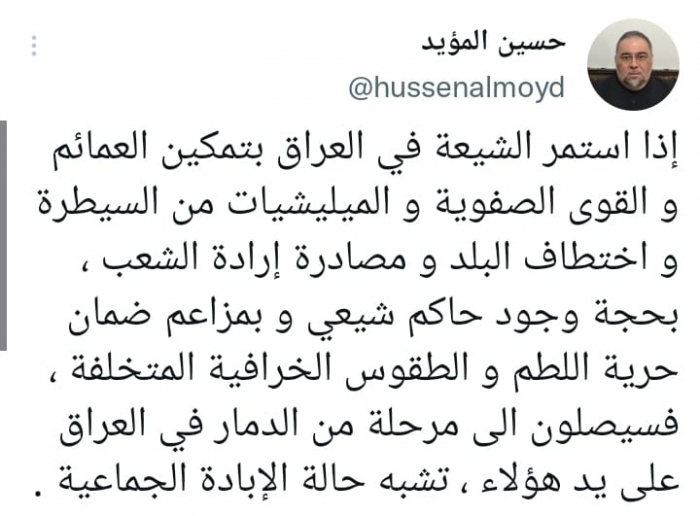 وشدد في تغريدة على حسابه بموقع التدوين المصغر تويتر، اليوم على أنه: "إذا استمر الشيعة في العراق بتمكين العمائم والقوى الصفوية والميليشيات من السيطرة واختطاف البلد ومصادرة إرادة الشعب، بحجة وجود حاكم شيعي".