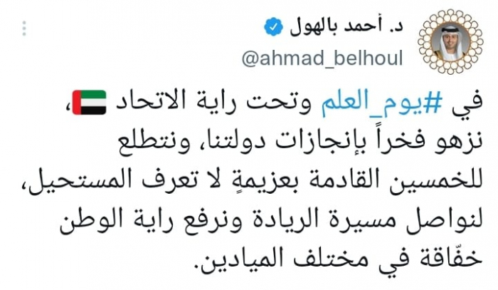 وأكد في تغريدة على حسابه بموقع التدوين المصغر تويتر، اليوم أن: "في يوم العلم تحت راية الاتحاد، نزهو فخراً بإنجازات دولتنا، ونتطلع للخمسين القادمة بعزيمةٍ لا تعرف المستحيل".