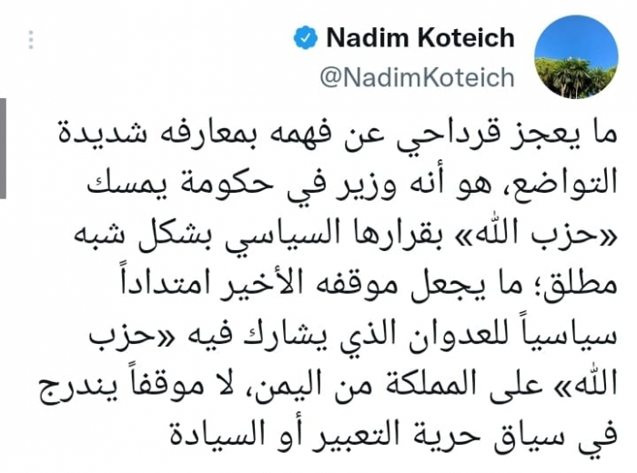 وأشار في تغريدة على حسابه بموقع التدوين المصغر تويتر، اليوم إلى أن: "ما يعجز قرداحي عن فهمه بمعارفه شديدة التواضع، هو أنه وزير في حكومة يمسك حزب الله بقرارها السياسي بشكل شبه مطلق".