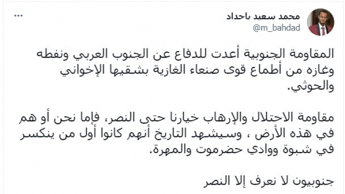 أكد الناشط السياسي محمد سعيد باحداد، أن شعب الجنوب رفع شعار مقاومة الاحتلال والإرهاب، حتى الانتصار على قوى صنعاء الغازية.