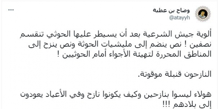وأشار في تغريدة عبر "تويتر"، اليوم: "ألوية جيش الشرعية بعد أن يسيطر عليها الحوثي تنقسم نصفين! نص ينضم إلى مليشيات الحوثي ونص ينزح إلى المناطق المحررة لتهيئة الأجواء أمام الحوثيين".