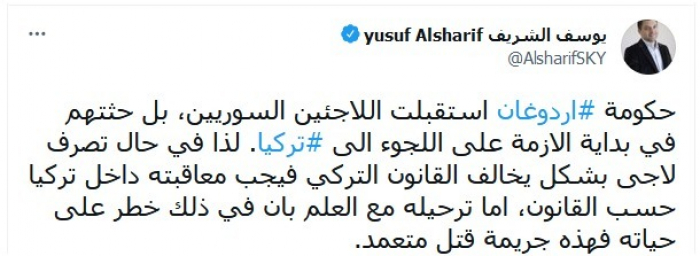وصف الكاتب الصحفي المتخصص في الشأن التركي يوسف الشريف، ترحيل النظام التركي للاجئين السوريين بـ"جريمة القتل المتعمد"، كون عملية الترحيل خطر على حياتهم خاصة وأن النظام التركي من دعاهم للجوء إليها.