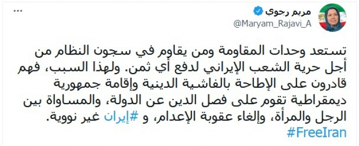 وبينّت في تغريدة عبر "تويتر"، اليوم: "تستعد وحدات المقاومة ومن يقاوم في سجون النظام من أجل حرية الشعب الإيراني لدفع أي ثمن".