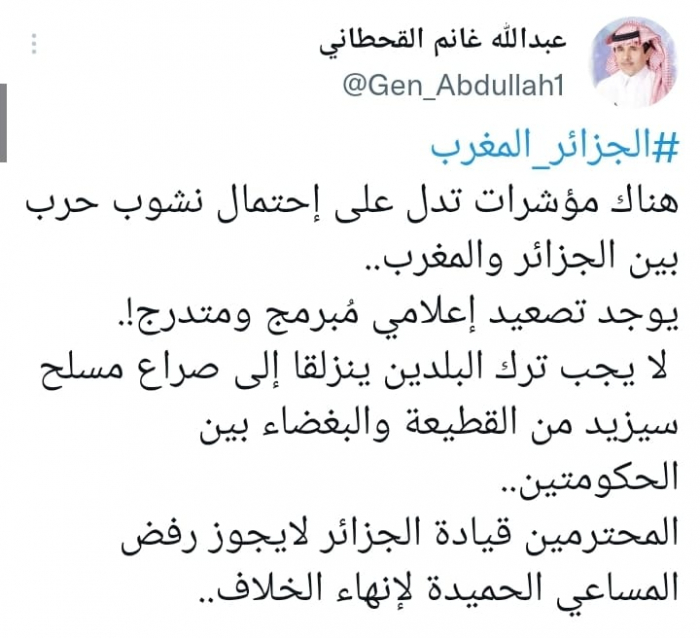 القحطاني يحذر من نزاع مسلح بين الجزائر والمغرب