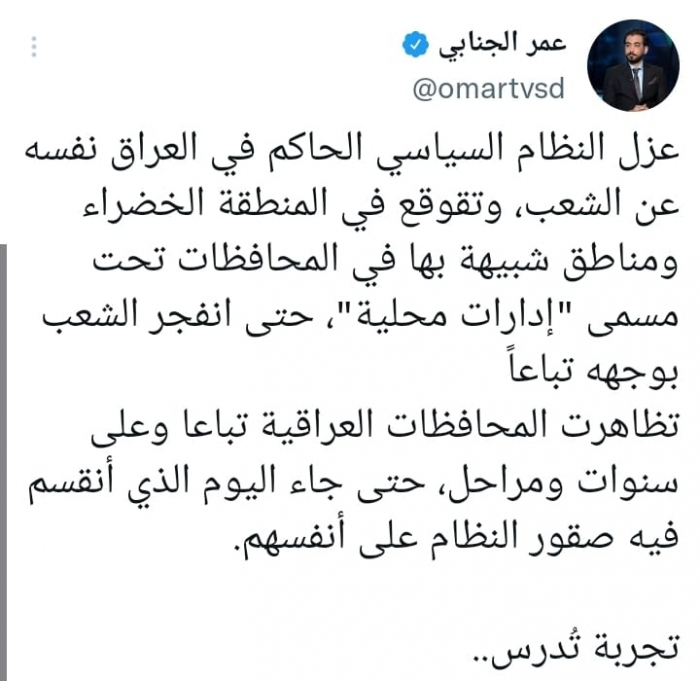 هاجم الكاتب الصحفي عمر الجنابي، المنظومة الحاكمة في العراق وانعزالها عن الشعب ومطالبه، حتى وصل إلى مرحلة الانفجار.