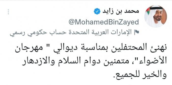 في تغريدة على حسابه بموقع التدوين المصغر تويتر، اليوم أن: "نهنئ المحتفلين بمناسبة ديوالي "مهرجان الأضواء"، متمنين دوام السلام والازدهار والخير للجميع".