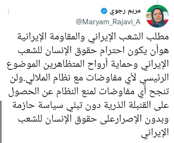 وكشفت في تغريدة على حسابه بموقع التدوين المصغر تويتر، اليوم أن: "مطلب الشعب الإيراني والمقاومة الإيرانية هو أن يكون احترام حقوق الإنسان للشعب الإيراني وحماية أرواح المتظاهرین الموضوع الرئيسي لأي مفاوضات مع نظام الملالي".