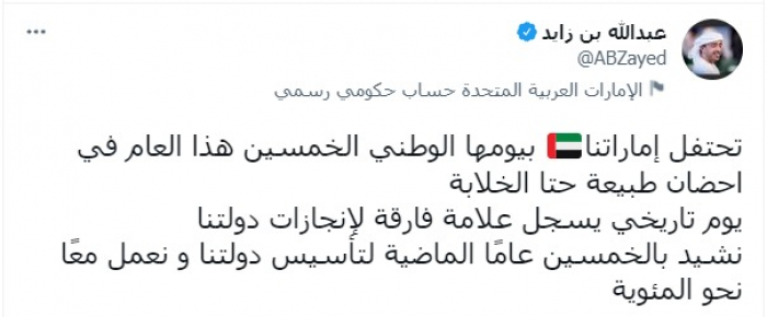 ووصف الاحتفال باليوم الوطني قائلا: "يوم تاريخي يسجل علامة فارقة لإنجازات دولتنا"، متابعا: "نشيد بالخمسين عاما الماضية لتأسيس دولتنا ونعمل معا نحو المئوية".