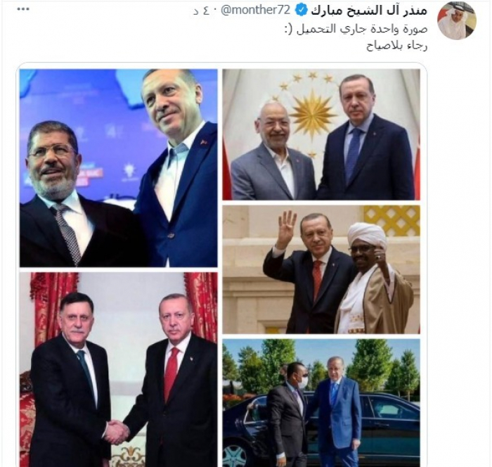 وضمت الصورة راشد الغنوشي، زعيم حركة النهضة الإخوانية بتونس والإطاحة به مؤخرا بقرارات مصيرية من الرئيس التونسي قيس سعيد، ومحمد مرسي الذي سقط نظامه الإخواني في ثورة 30 يونيو بمصر، والرئيس السوداني السابق عمر البشير، وفائز السراج الذي أجبر على تقديم استقالته من رئاسة الحكومة الليبية في ضوء الاتفاقيات غير الشرعية مع النظام التركي.
