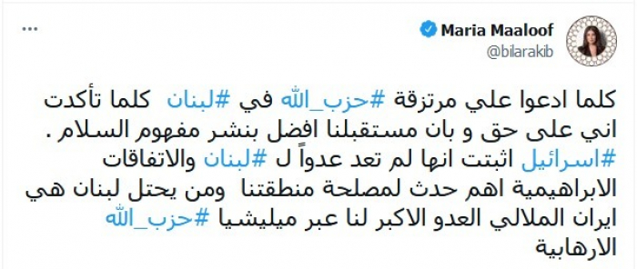 واعتبرت أن: "إسرائيل أثبتت أنها لم تعد عدوا للبنان والاتفاقات الإبراهيمية أهم حدث لمصلحة منطقتنا".