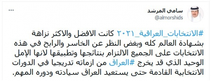 ولفت في تغريدة عبر "تويتر"، اليوم، إلى تلك الانتخابات، قائلا: "الانتخابات العراقية 2021، كانت الأفضل والأكثر نزاهة بشهادة العالم كله وبغض النظر عن الخاسر والرابح في هذه الانتخابات".
