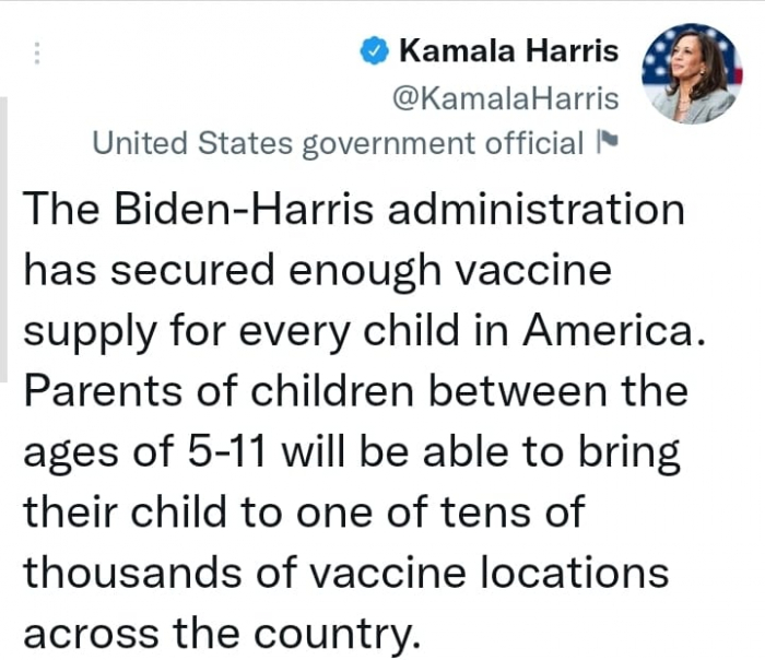 وأكدت في تغريدة على حسابها بموقع التدوين المصغر تويتر، اليوم أنه: "أمنت إدارة بايدن هاريس إمدادات لقاح كافية لكل طفل في أمريكا".