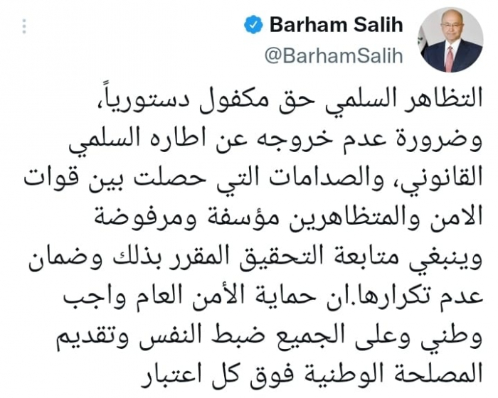 أكد الرئيس العراقي برهم صالح، أن الدستور يكفل حق التظاهر السلمي، مستنكرا أعمال الشغب والعنف من المتظاهرين المناصرين للمليشيات الموالية لنظام ملالي طهران بعد خسارتها في الانتخابات النيابية.
