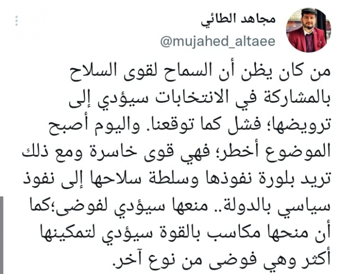 وقال في تغريدة على حسابه بموقع التدوين المصغر تويتر، اليوم: "من كان يظن أن السماح لقوى السلاح بالمشاركة في الانتخابات سيؤدي إلى ترويضها؛ فشل كما توقعنا".