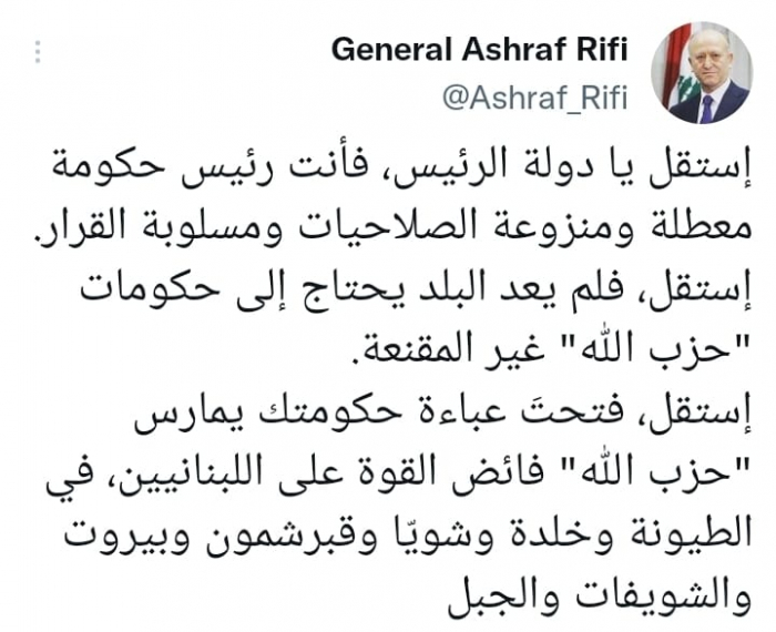 ووجه في تغريدة على حسابه بموقع التدوين المصغر تويتر، اليوم حديثه إلى ميقاتي قائلا: "استقل يا دولة الرئيس، فأنت رئيس حكومة معطلة ومنزوعة الصلاحيات ومسلوبة القرار".