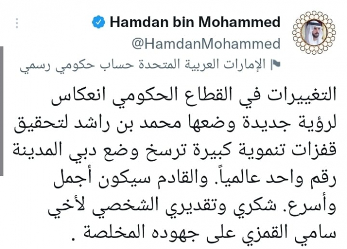 وأشار في تغريدة على حسابه بموقع التدوين المصغر تويتر، اليوم إلى أن: "التغييرات في القطاع الحكومي انعكاس لرؤية جديدة وضعها محمد بن راشد لتحقيق قفزات تنموية كبيرة ترسخ وضع دبي المدينة رقم واحد عالمياً".