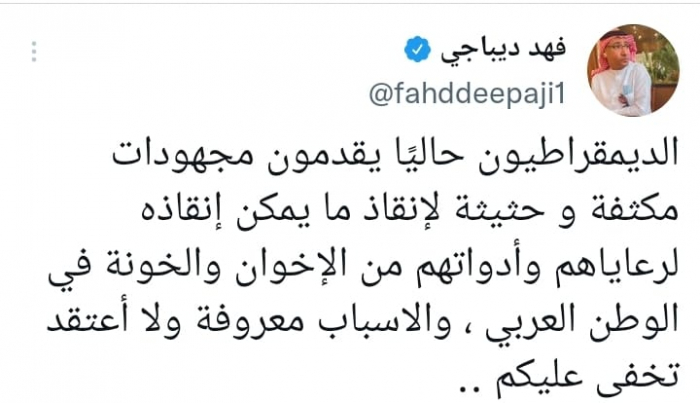 وأكد في تغريدة على حسابه بموقع التدوين المصغر تويتر، اليوم أن: "الديمقراطيون حاليًا يقدمون مجهودات مكثفة وحثيثة لإنقاذ ما يمكن إنقاذه لرعاياهم وأدواتهم من الإخوان والخونة في الوطن العربي، والأسباب معروفة ولا أعتقد تخفى عليكم".
