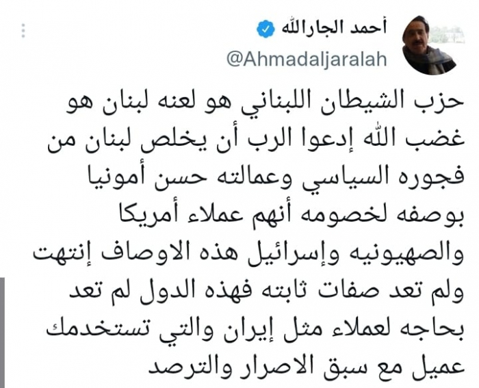 وصف الكاتب الكويتي أحمد الجارالله، مليشيا حزب الله الموالية لنظام ملالي طهران، بأنها لعنة حلت على لبنان، مؤكدا أنه عميل للنظام الإيراني.