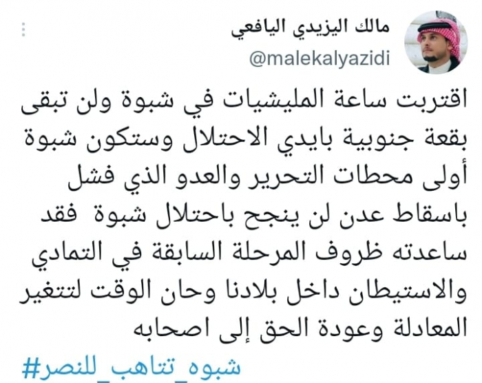 وشدد في تغريدة على حسابه بموقع التدوين المصغر تويتر، اليوم على أنه: "اقتربت ساعة المليشيات في شبوة ولن تبقى بقعة جنوبية بأيدي الاحتلال".
