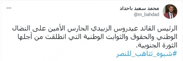 ووصف الرئيس "الزُبيدي"، في تغريدة عبر "تويتر"، اليوم، بـ"الحارس الأمين على النضال الوطني والحقوق والثوابت الوطنية التي انطلقت من أجلها الثورة الجنوبية".