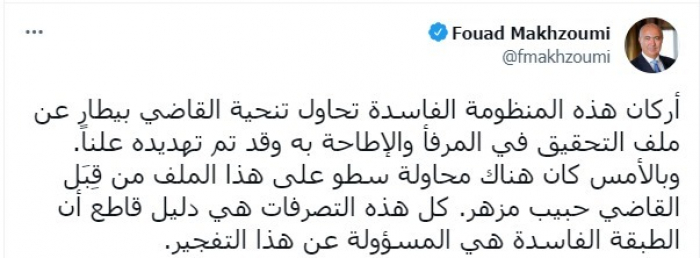 ووصف في تغريدة عبر "تويتر"، اليوم، مليشيا حزب الله، بـ"المنظومة الفاسدة"، متابعا: "تحاول تنحية القاضي بيطار عن ملف التحقيق في المرفأ والإطاحة به وقد تم تهديده علنا".