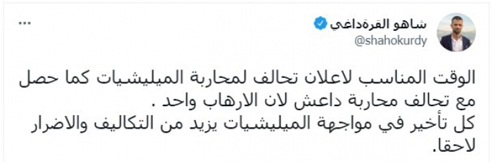 طالب الكاتب الصحفي العراقي شاهو القرة داغي، بإعلان تحالف لمحارية إرهاب مليشيات إيران في العراق، بعد محاولتهم الفاشلة لاغتيال رئيس الوزراء مصطفى الكاظمي.