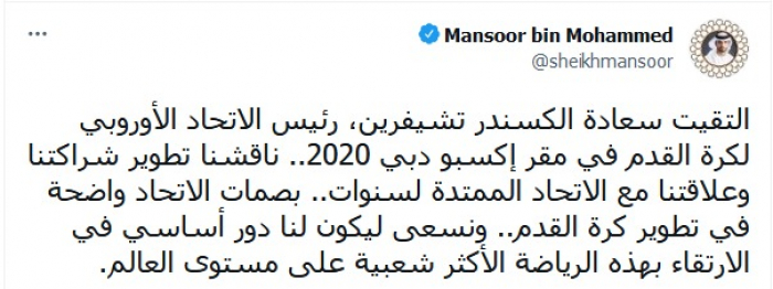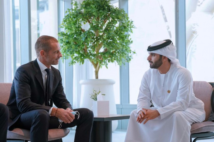 التقى الشيخ منصور بن محمد بن راشد، رئيس مجلس دبي الرياضي، ألكسندر تشيفرين، رئيس الاتحاد الأوروبي لكرة القدم، في مقر إكسبو دبي 2020.