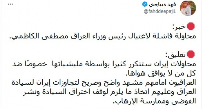 علق المحلل السياسي السعودي فهد ديباجي، على المحاولة الفاشلة لاغتيال رئيس الوزراء العراقي مصطفى الكاظمي، في مقر إقامته ببغداد.