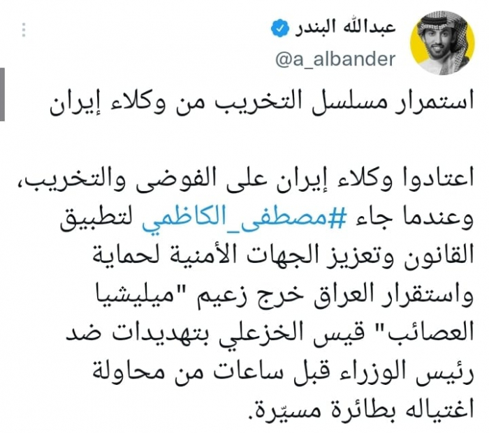 وأشار إلى أنهم: "اعتادوا وكلاء إيران على الفوضى والتخريب، وعندما جاء مصطفى الكاظمي لتطبيق القانون وتعزيز الجهات الأمنية لحماية واستقرار العراق خرج زعيم "ميليشيا العصائب" قيس الخزعلي بتهديدات ضد رئيس الوزراء قبل ساعات من محاولة اغتياله بطائرة مسيّرة".