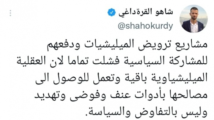 واعتبر في تغريدة على حسابه بموقع التدوين المصغر تويتر، اليوم أن: "مشاريع ترويض الميليشيات ودفعهم للمشاركة السياسية فشلت تماما لأن العقلية الميليشياوية باقية وتعمل للوصول إلى مصالحها بأدوات عنف وفوضى وتهديد وليس بالتفاوض والسياسة".