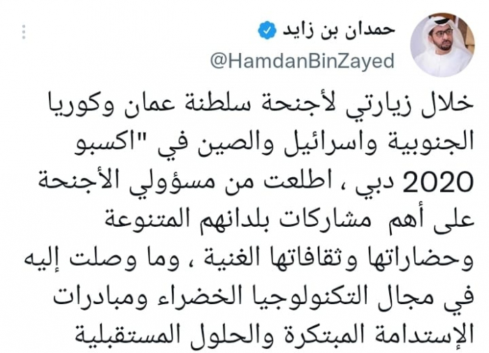 وقال في تغريدة على حسابه بموقع التدوين المصغر تويتر، اليوم إن: "خلال زيارتي لأجنحة سلطنة عمان وكوريا الجنوبية وإسرائيل والصين في إكسبو 2020 دبي، اطلعت من مسؤولي الأجنحة على أهم مشاركات بلدانهم المتنوعة وحضاراتها وثقافاتها الغنية".